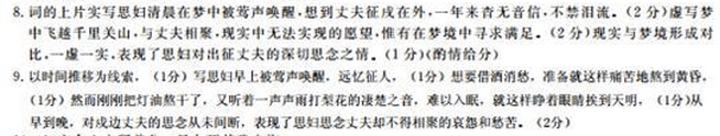 【宋】无名氏 枝上流莺和泪闻。新啼痕间旧啼痕。一春鱼鸟无消息,千里关山劳梦魂。 无一语,对芳尊。安排肠断到黄昏。甫能炙得灯儿了,雨打梨花深闭门。 【注】①关于该词作者作者一说为秦观。②芳尊:即酒樽。③甫能:宋时方言,刚刚,才。 8.请从虚实的角度简要分析这首词的上阕。(5分) 9.这首词是以什么为线索来写的?表现了词中人物怎样的心情?请简要阐述。(6分) 参考答案 ![]() 赏析: 词的上片写思妇凌晨在梦中被莺声唤醒,远忆征人,泪流不止。“梦”是此片的关节。后两句写致梦之因,前两句写梦醒之果。致梦之因,词中写了两点:一是丈夫征戌在外,远隔千里,故而引起思妇魂牵梦萦,此就地点而言;一是整整一个春季,丈夫未寄一封家书,究竟平安与否,不得而知,故而引起思妇的忧虑与忆念,此就时间而言。从词意推知,思妇的梦魂,本已缥缈千里,与丈夫客中相聚,现实中无法实现的愿望,在梦境中得到了满足。这是何等的快慰,然而树上黄莺一大早就恼人地歌唱起来,把她从甜蜜的梦乡中唤醒。她又回到双双分离的现实中,伊人不见,鱼鸟音沉。于是,她失望了,痛哭了。 过片三句,写女子在白天的思念。她一大早被莺声唤醒,哭干眼泪,默然无语,千愁万怨似乎随着两行泪水咽入胸中。但是胸中的郁懑总得要排遣,于是就借酒浇愁。可是如李白所说:“花间一壶酒,独酌无相亲。”一怀愁怨,触绪纷来,只得“无一语,对芳尊”,准备就这样痛苦地熬到黄昏。李清照《声声慢》云:“守着窗儿独自,怎生得黑?”词意相似。唯李词音涩,声情凄苦;此词音滑,似满心而发,肆口而成,然无限深愁却蕴于浅语滑调之中,读之令人凄然欲绝。 结尾两句,融情入景,表达了绵绵无尽的相思。 “甫能”二字,宋时方言,犹今语刚才。这里是说,刚刚把灯油熬干了,又听着一叶叶、一声声雨打梨花的凄楚之音,就这样睁着眼睛挨到天明。词人不是直说彻夜无眼,而是通过景物的变化,婉曲地表达长时间的忆念,用笔极为工巧。 这首词有一个好处,就是因声传情,声情并茂。词人一开头就抓住鸟莺啭的动人旋律,巧妙地溶入词调,通篇宛转流畅,环环相扣,起优跌宕,一片官商。清人陈廷焯称其“不经人力,自然合拍”,可谓知音。细细玩索,就可以体会到其中的韵味。 |